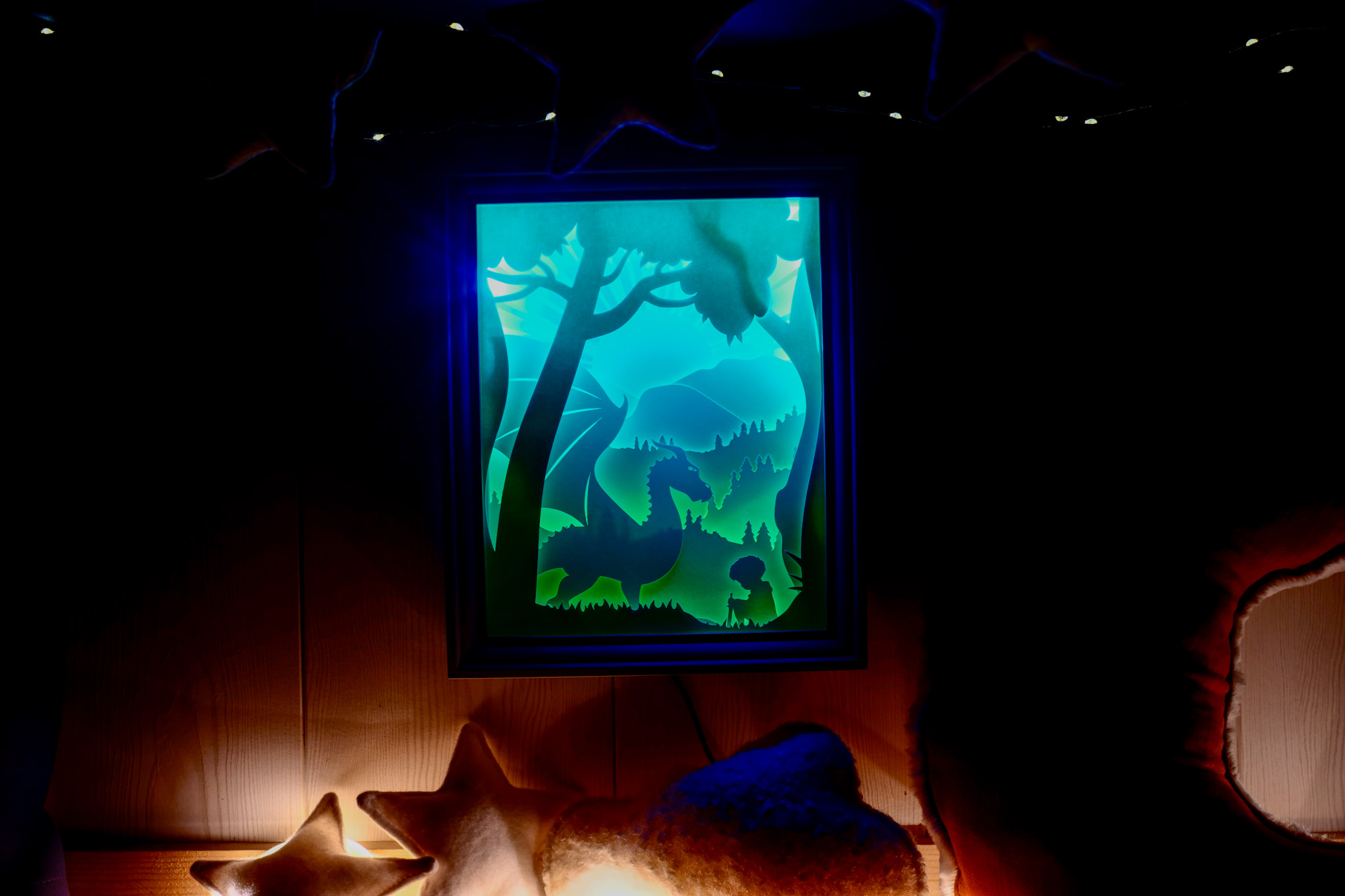Ce cadre est composé de 9 couches de papier découpé, créant un effet de profondeur unique.Il est équipé d’une bande LED intégrée qui diffuse une lumière douce et chaleureuse.Chaque création est fournie avec son adaptateur, ainsi qu’un cordon avec interrupteur pour une utilisation simple au quotidien.